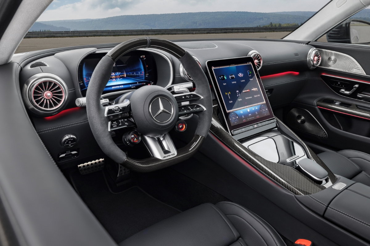 全新 Mercedes-AMG GT Coupé 採用駕駛者導向設計,搭載全新 MBUX 2.0 系統結合11.9吋中央觸控螢幕,加上 AMG 專屬氛圍及資訊畫面,數位科技氛圍滿點,也可透過 AMG TRACK PACE 功能即時掌握車輛性能表現。透過 Nappa 皮質包覆的 AMG Performance 跑車方向盤轉動控制旋鈕,即可在 AMG DYNAMIC SELECT 駕駛模式之間任意切換。此外,全新 Mercedes-AMG GT Coupé 不僅將性能推向極致,更誓言滿足日常需求,因此首次推出 2 + 2 座的配置,並提供 HANDS-FREE 尾門腳踢感應開啟功能,還可搭配後座傾倒功能加大後廂置物空間。除了賽道黑科技,用於一般道路的創新科技也全面導入,搭載最新世代智慧駕駛輔助功能,即便是為賽道而生的 GT 雙門跑車,也能從容應付豪華的公路之旅。