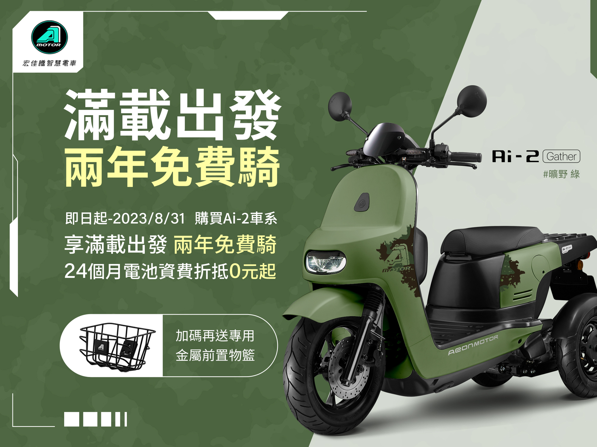 即日起至 8月 31 日止,凡購買三輪智慧電車 Ai-2 Gather 即可享有 24 個月 Gogoro Network® 電池資費 $319 元折抵優惠(價值 $7,656 元),月繳最低 $0 元起,另加贈專屬鋁合金輕量化前置物籃一組(價值 1,700 元);除優惠好禮外,還可再搭配信用卡 30 期 0 利率,限時優惠貼心為消費者減輕購車負擔,有興趣可盡速至鄰近宏佳騰智慧電車門市洽詢及預約試乘,即日起至全台宏佳騰智慧電車門市預約試乘並完成指定任務,即可獲贈限量專屬騎乘雨衣套組(含試車戀愛輕便雨衣與杜蕾斯好禮),活動只到 9 月 15 日 。