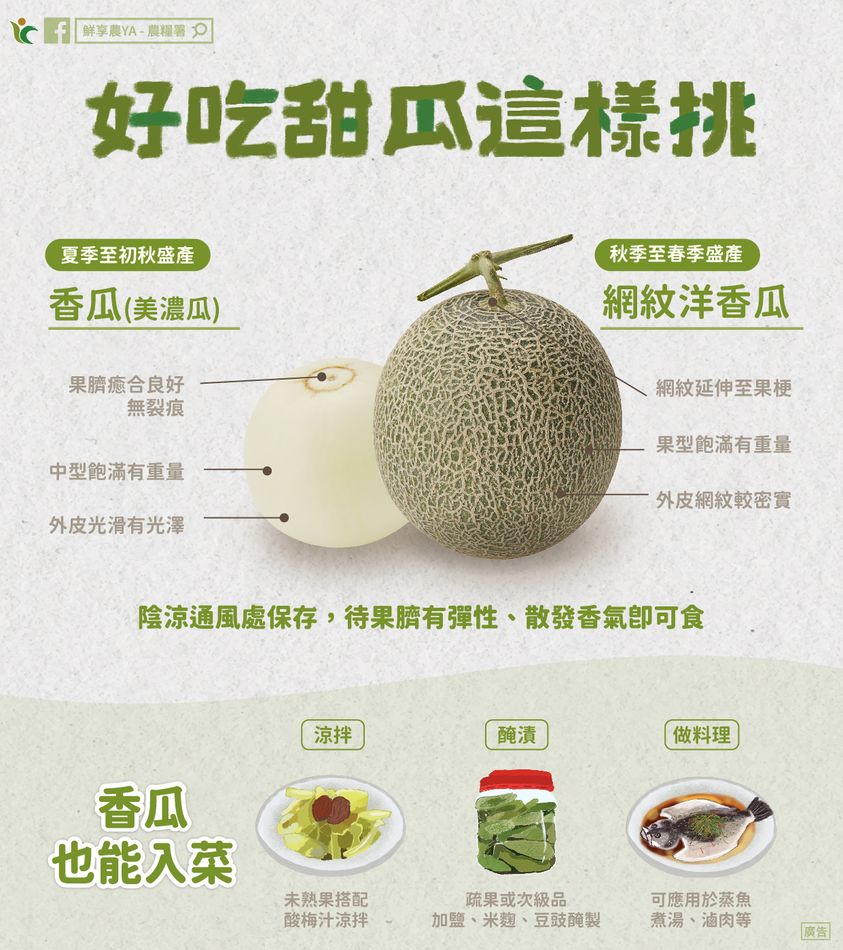 ▲台灣栽培的甜瓜有3種類型,分別為洋香瓜、哈密瓜及東方型甜瓜,可直接吃也可做成醃漬小菜。(圖/擷取自鮮享農YA - 農糧署臉書粉絲團)