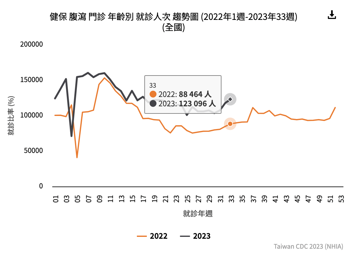 監測資料顯示,今年第 33 週健保腹瀉門診就診計有 123,096 人次,較第 32 週的 117,969 略增 4.4%,而第 32 週的就診人次較第 31 週的 107,383 人增加 9.8%,且均略高於去年同期。
