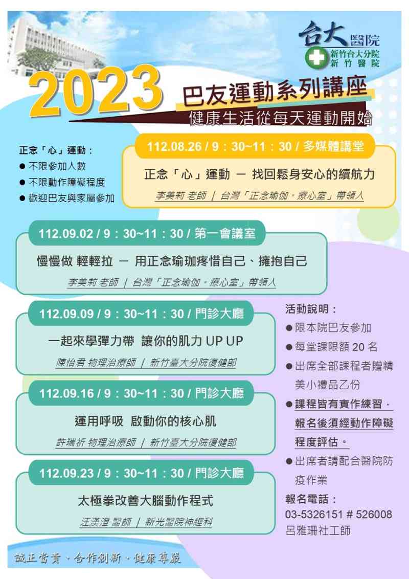 為了增加病人運動機會,新竹臺大分院社工師呂雅珊規劃一系列巴金森運動系列講座,特別邀請四位講師,將於8月26日至9月23日每週六上午,於新竹醫院舉辦5場巴金森運動系列講座,針對巴金森氏症病人的柔軟度、肌肉力量、平衡感進行運動教學,讓病人體驗多種運動並從中找尋適合的運動方式。8月26日、9月2日「正念瑜珈」將引領病人透過身心合一,找到身體與心理的內在力量;9月9日、16日「肌肉力量訓練」,有助於病人穩定肢體、減少跌倒發生;9月23日「太極拳」,有助於病人穩定下半身重心,促進平衡感及手眼協調性。