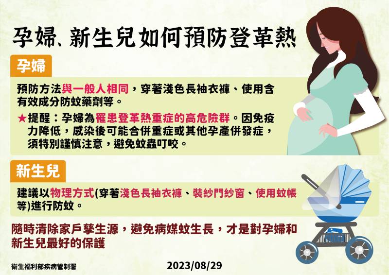 疾管署發言人曾淑慧表示,孕婦、新生兒都是感染登革熱的重症高風險族群,根據相關研究顯示,孕婦如果感染登革熱死亡率是一般孕婦的4倍,新生兒則是3倍,所以孕婦、新生兒都要避免感染登革熱。