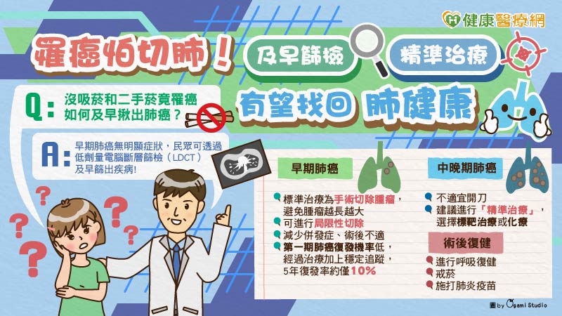 他進一步說明,第一期肺癌復發機率低,經過手術切除加上穩定追蹤,5年復發率約僅10%;第二期以上建議追加化療、標靶或免疫等術後輔助治療,同樣須好好追蹤,以控制病情。若產生抗藥性,則再進入第二線治療。