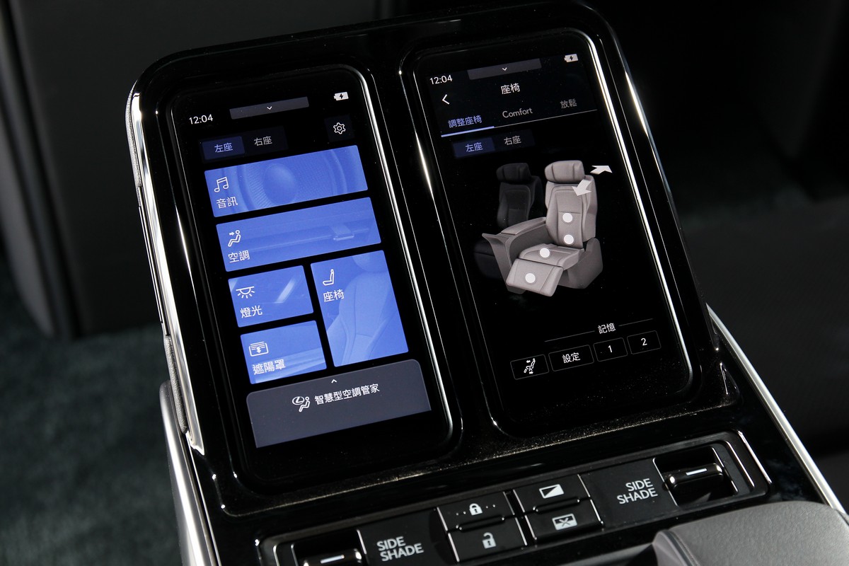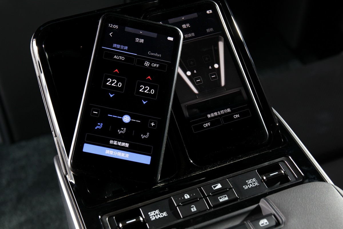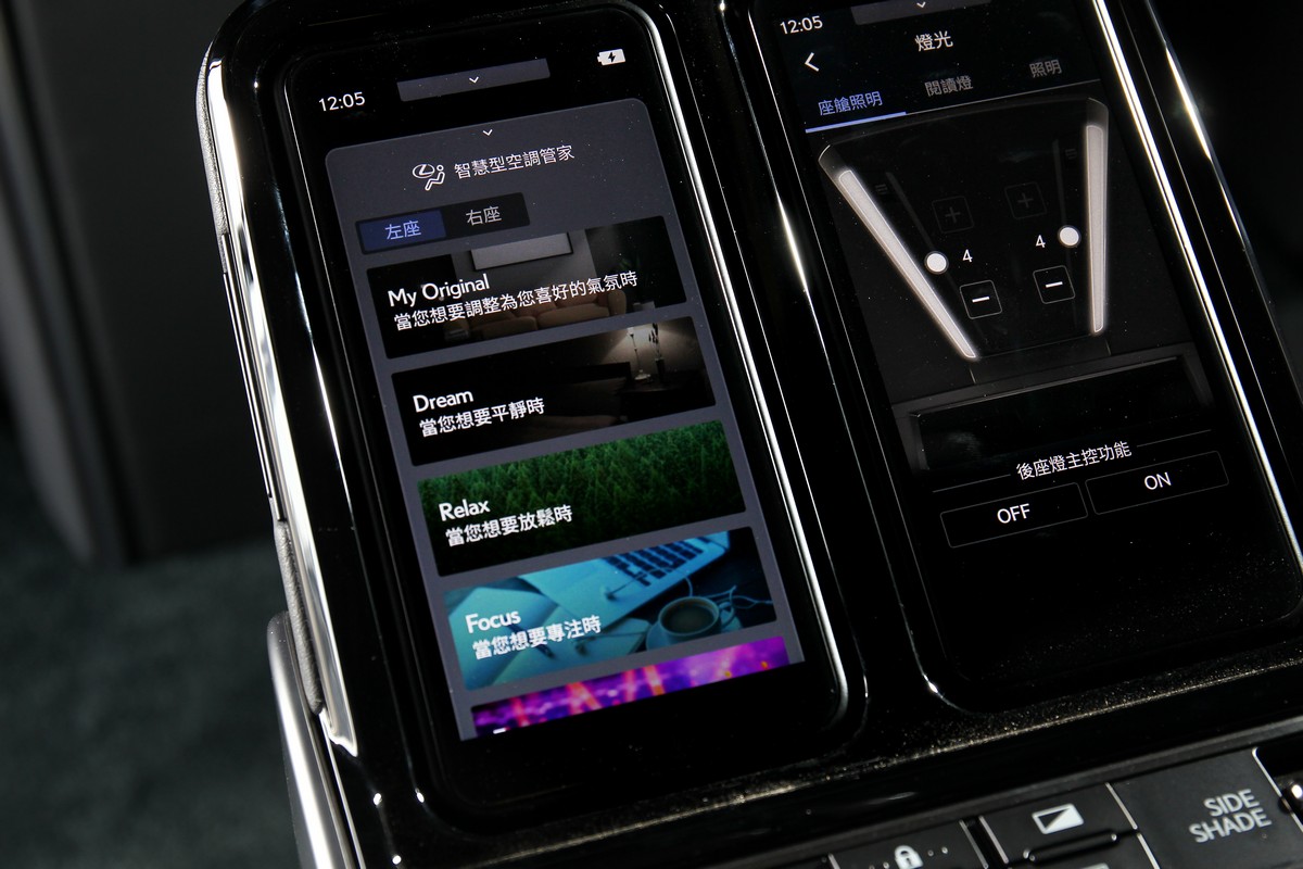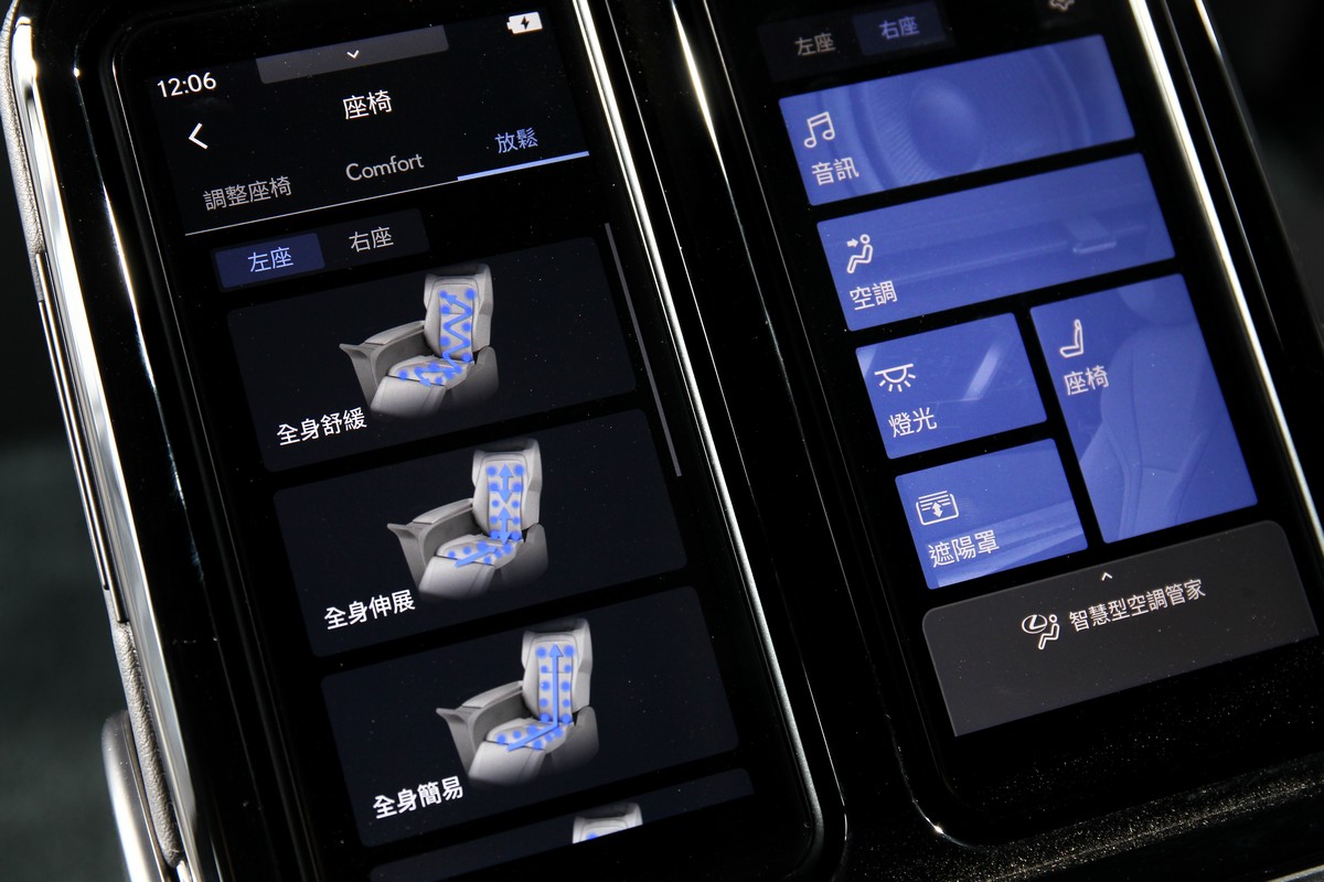 後座宛如智慧型手機般的可拆卸控制面板功能相當豐富,包括恆溫空調、環繞音響、氛圍照明、座椅角度、按摩模式與遮陽簾等皆可在此操作。
