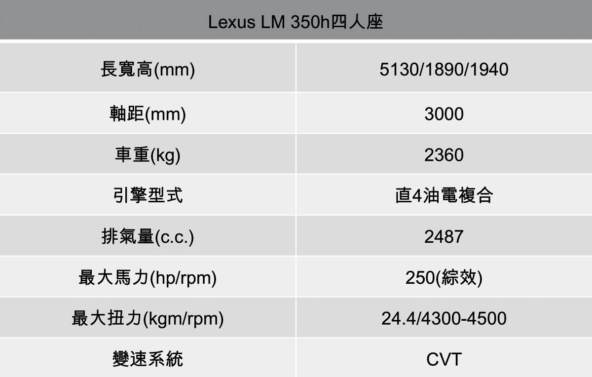 關於Lexus LM,必須說這其實算是小眾中的小眾,特別是這天我們所試的四人座車型,霸氣的5,130mm車長配上3,000mm軸距,扣除前座駕駛艙之外,偌大的車廂竟僅放進兩張座椅,很顯然就直接排除掉「請不起」司機的一大票買家,我說話就這麼直,一位每天朝夕相處值得信任的專業駕駛含勞健保三節獎金一年不花你百萬也要七、八十,聘個幾年比起買輛車可更昂貴,所以看待全新Lexus LM 350h四人座,得先放下平常試車切入的角度,專注從後座感受著眼,提供大老闆們有效建議不敢當,起碼過過寄生上流的癮頭。