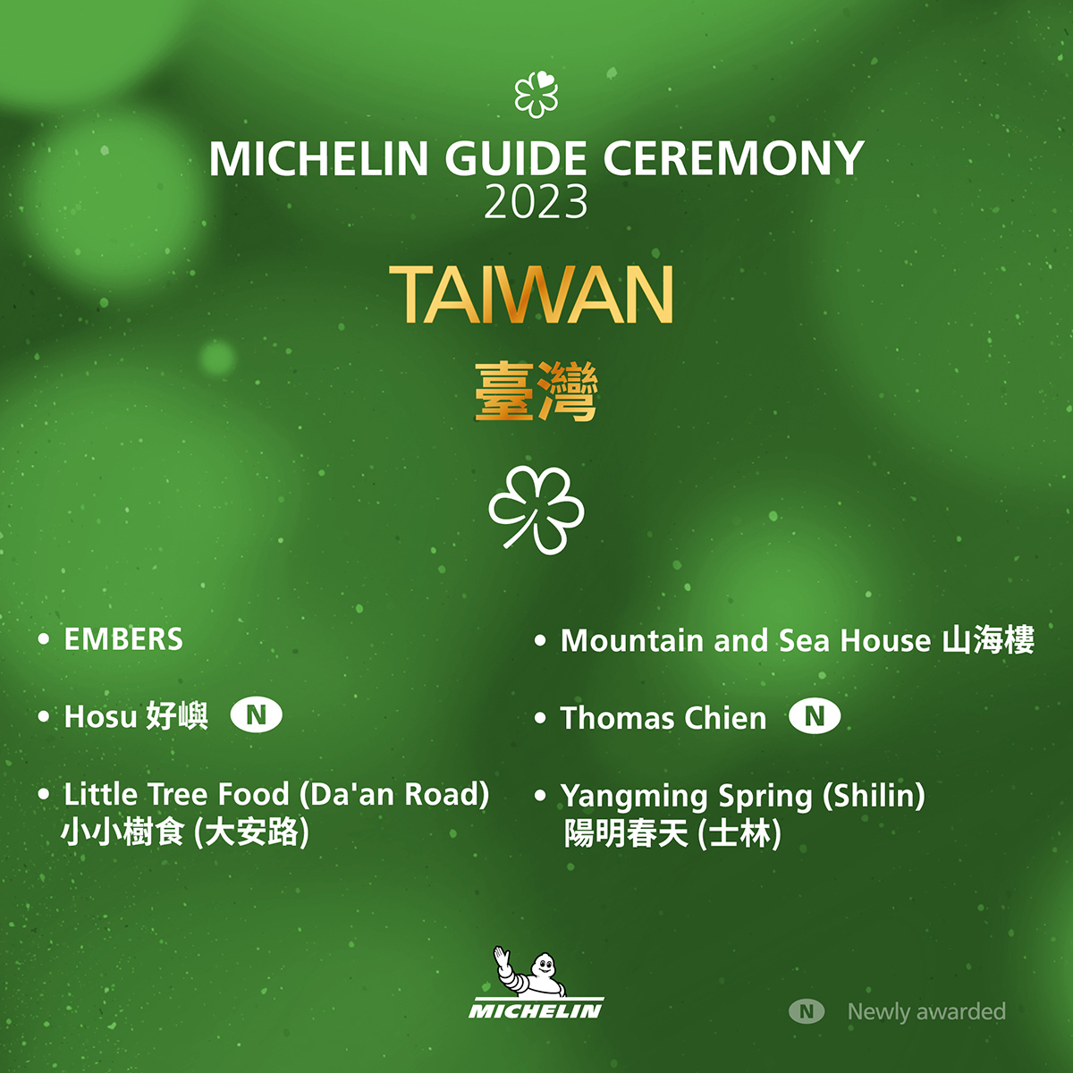 連同 2 家新獲得米其林綠星肯定的餐廳,以及之前獲得綠星的 4 家餐廳包括 EMBERS、小小樹食 (大安路)、山海樓以及陽明春天(士林),《臺灣米其林指南 2023》共有 6 家餐廳獲得米其林綠星肯定。
