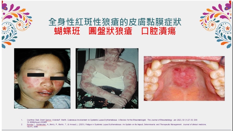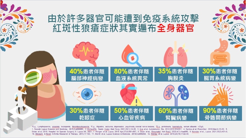 而且由於自體免疫系統攻擊不同器官,容易伴隨骨骼關節病變、血液系統異常、腎臟及心血管疾病等諸多共病。根據統計,超過50%的病患在診斷後10年內會產生不可逆的器官損傷,死亡率更是一般人的2.6倍,其中又以感染症、心血管疾病及惡性腫瘤為前3大死因。另外,因狼瘡腎炎引發的急性腎衰竭以及長期使用高劑量類固醇,亦是死亡的高風險因子。