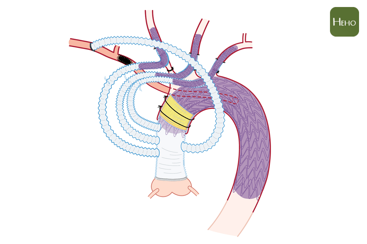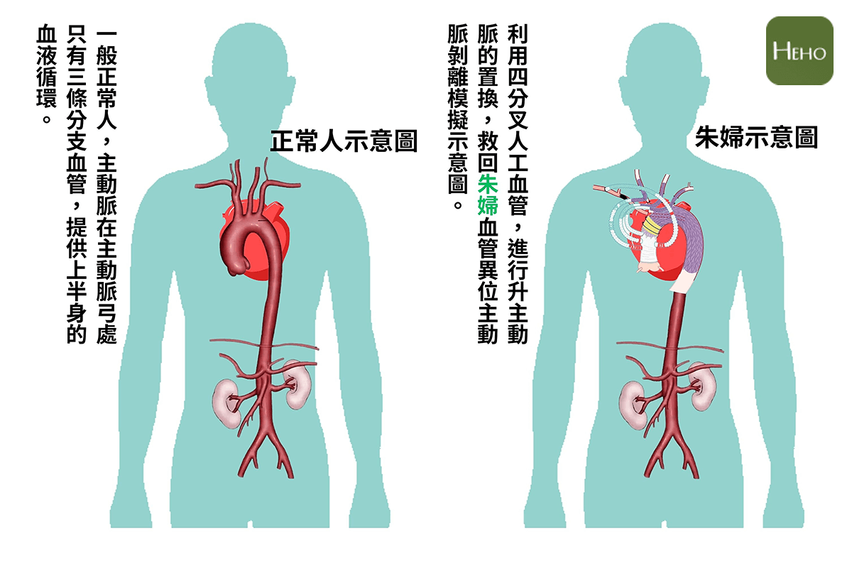 這次朱婦因主動脈剝離合併血管異位需緊急手術,除了主動脈血管剝離需處理之外,連同主動脈弓及 4 條次幹道血管分支都同次手術矯正,避免後續再發生問題。