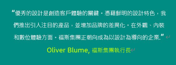 『優秀的設計是創造客戶體驗的關鍵。憑藉鮮明的設計特色,我們推出引人注目的產品,並增加品牌的差異化。在外觀、內裝和數位體驗方面。福斯集團正朝向成為以設計為導向的企業』。