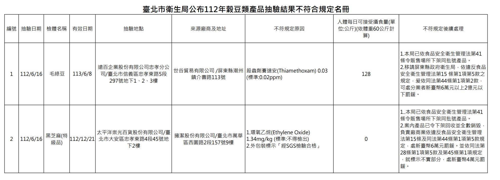 台北市衛生局至零售業者、超市、賣場等處抽驗穀豆類產品,檢驗是否殘留農藥及環氧乙烷,共計抽驗 30 件穀豆類產品,包括 23 件輸入及 7 件國產穀豆類產品,檢驗結果 2 件產品不符規定。檢驗出 1 件印度產地的「黑芝麻」有殘留環氧乙烷,卻標示檢驗合格。另 1 件印尼產地「毛綠豆」則殘留農藥殺蟲劑賽速安,不符農藥殘留容許量標準。