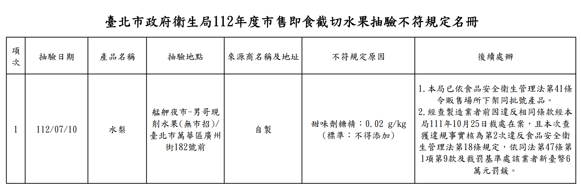 同時,台北市衛生局也抽查夜市及日市的即食截切水果攤販,共抽查 25 件產品,檢驗甜味劑 13 項,檢驗結果 1 件不符規定,不合格率 4%。不合格的產品為水梨,是在艋舺夜市檢出,而水梨中則被驗出甜味劑糖精,違反食品添加物使用範圍及限量暨規格標準。