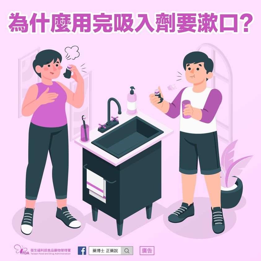 食藥署提醒,吸入劑的使用除了操作正確、按時吸藥之外,使用到類固醇成分的吸入劑,也務必落實漱口,才能有效控制疾病的進展,又能避免副作用發生。