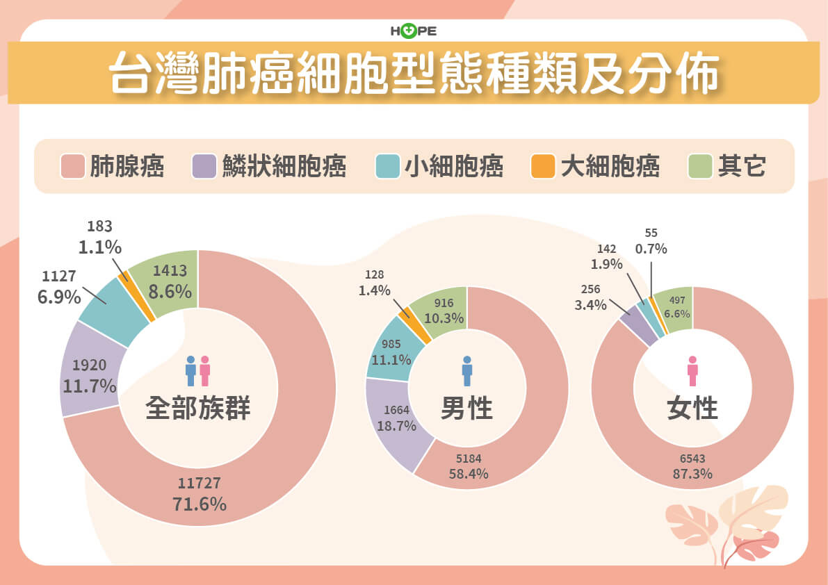 肺腺癌好發於女性、未抽菸者,台灣女性抽菸比率低,女性肺癌病人有近九成是肺腺癌,男性也有近六成是肺腺癌,未抽菸者也要小心肺癌!抽菸者比較容易罹患小細胞肺癌、鱗狀細胞癌。