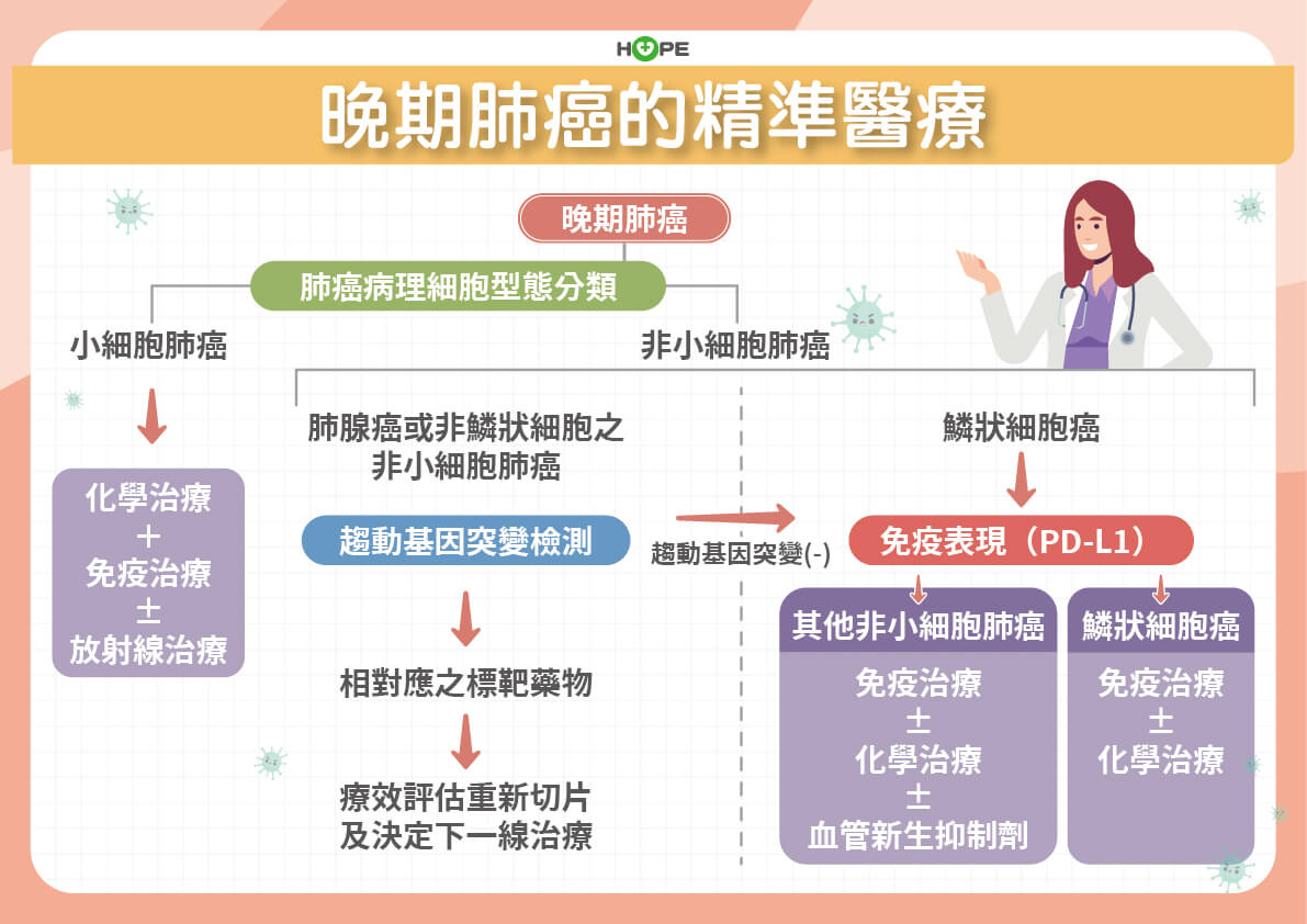 曾政森說,晚期小細胞肺癌的標準治療是化療加免疫療法,或是再以放射治療輔助加強。晚期肺腺癌要先做基因檢測,有驅動基因變異可尋找相對應的標靶藥物治療;沒有驅動基因變異,可以做PD-L1染色,依表現量高低選擇免疫療法、化療或是再加上血管新生抑制劑等。鱗狀細胞肺癌也是依據PD-L1表現量高低決定免疫治療或化療等。