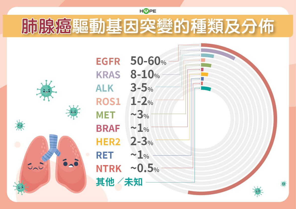 台灣晚期肺腺癌病人最常見的基因突變是EGFR,超過五成都是此基因突變,其他還有ALK、KRAS 、ROS1 、MET、 BRAF、 HER2 、RET 、NTRK等基因突變,上述9種基因突變都已有標靶藥物可以治療。