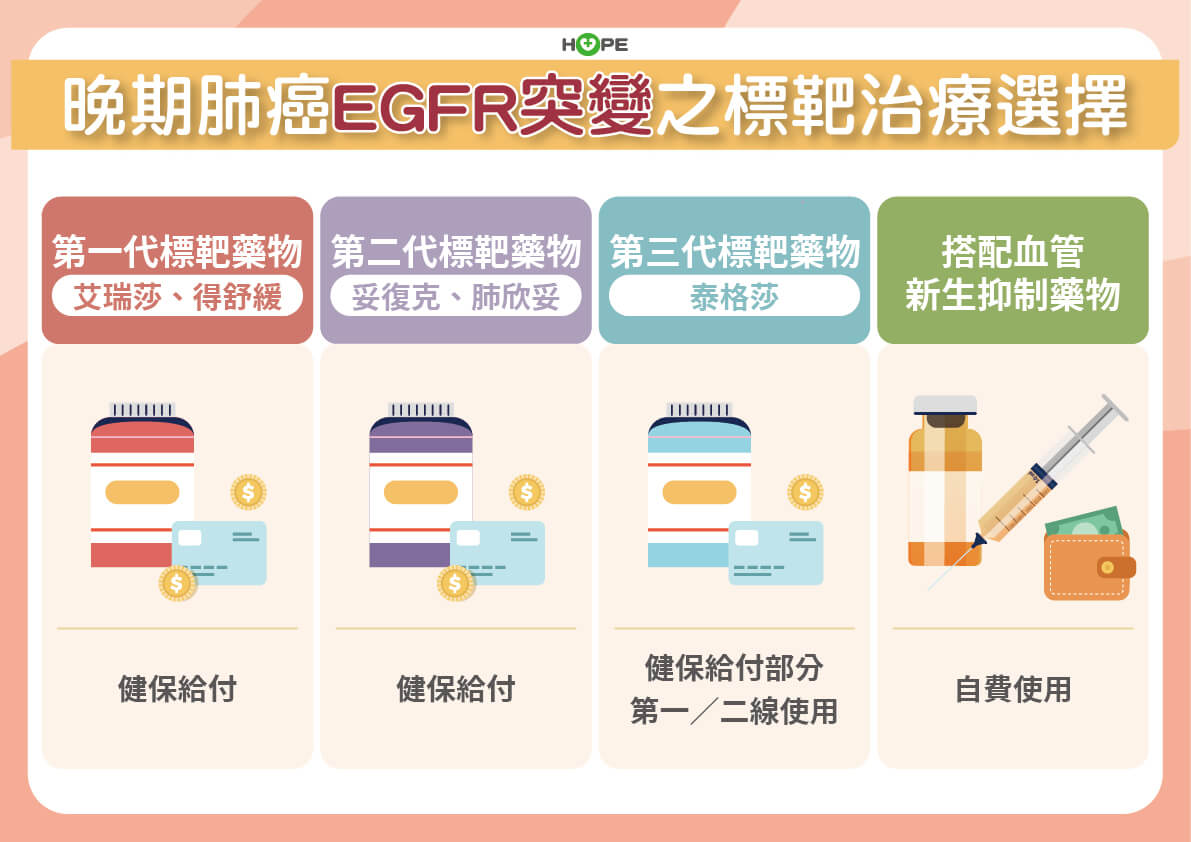 EGFR基因突變有5種標靶藥物可供選擇,第一代是艾瑞莎、得舒緩,有健保給付。第二代為妥復克、肺欣妥,有健保給付;肺欣妥要未腦轉移的病人才有健保給付。第三代是泰格莎,健保給付條件是:1、Exon19位點突變且合併腦部轉移病人的第一線治療。2、第一、二代標靶藥物治療後產生抗藥性,做為第二線治療。