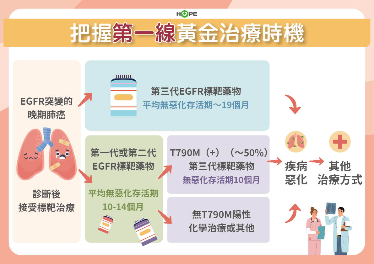晚期肺腺癌病人第一線使用第一代或第二代EGFR標靶藥物,平均無惡化存活期為10-14個月,之後會產生抗藥性,其中約一半的病人會出現T790M的基因突變,此時可以使用第三代標靶藥物治療,無惡化存活期約10個月;沒有出現T790M的基因突變,可進行化療或尋求其他臨床實驗治療等。