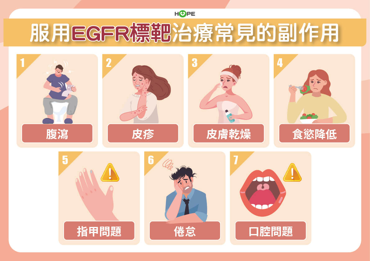 EGFR標靶藥物常見的副作用包括皮膚乾燥、皮疹、甲溝炎、嘴巴潰瘍、口腔發炎、腸胃道腹瀉、食慾下降、肝功能異常等,少數人會發生肺部發炎,有些藥物還會影響心臟功能,必須定期追蹤,有症狀應馬上跟醫護反應。
