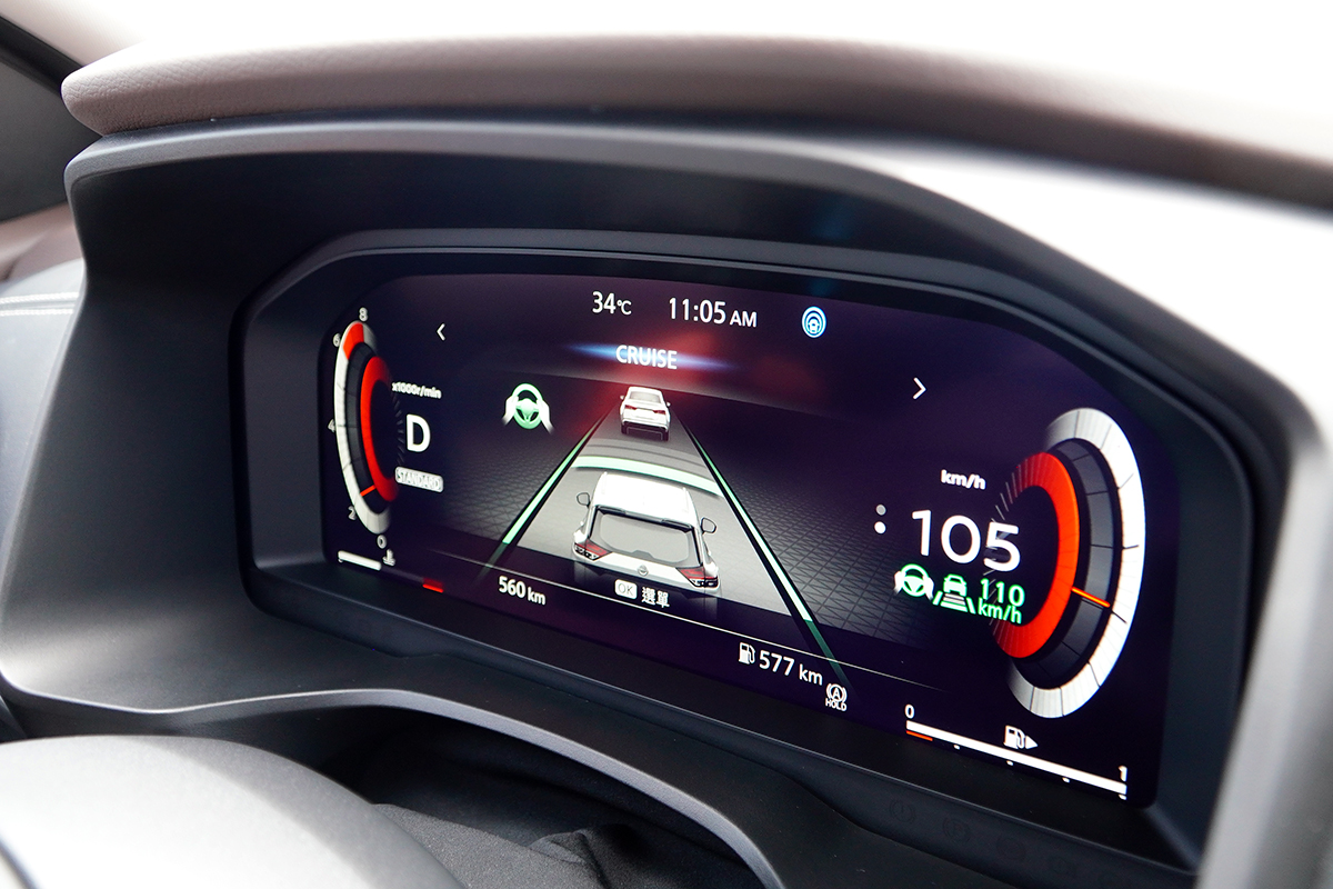 數位座艙中配有「12.3吋數位儀錶板」、「12.3吋數位影音主機」與「10.8吋數位抬頭顯示器」。 進入座艙,X-Trail輕油電基本鋪陳都與e-Power版本相同,不過兩者還是有等級與價格上的差異,所以座椅包覆材質上並不相同,X-Trail輕油電採用較基本的皮質包覆,質感與與e-Power版本的格紋皮椅略有差距,配備上僅少了電動天窗,BOSE Premium Sound音響、12.3吋數位儀錶板「12.3吋數位影音主機與原廠衛星導航、無線充電板等都還是標配,同時本次試駕的輕油店旗艦版還是配有雙座附有記憶功能的電動調整功能,還是相當實用。