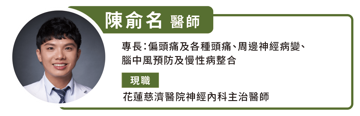 陳俞名也提醒,如果你是一般程度輕微的頭痛,可至家醫科或是內科系門診掛號診治;如果發現可能是屬於較困難或複雜難治的偏頭痛,可至神經科或疼痛科諮詢專科醫師,及早治療免長期偏頭痛之苦。
