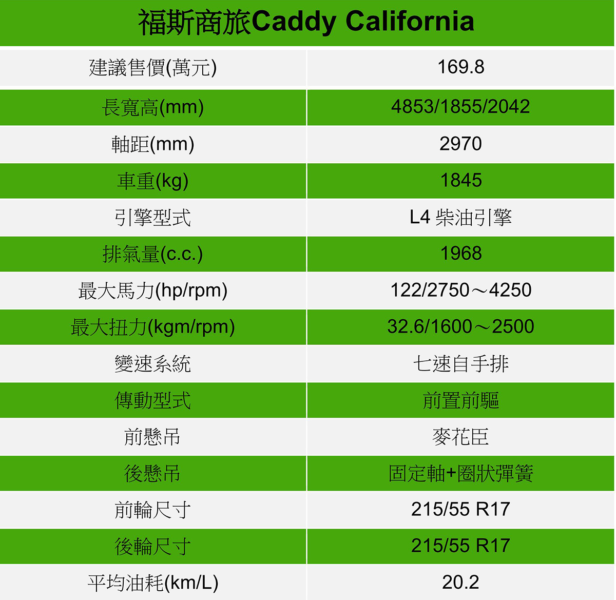 Caddy California搭載2.0升柴油引擎,122hp/32.6kgm動力給予相當輕快的加速反應。