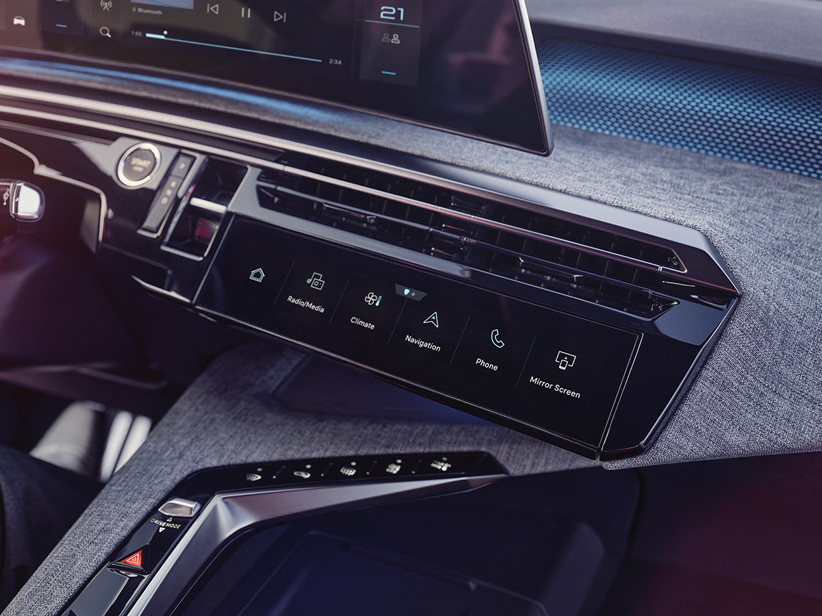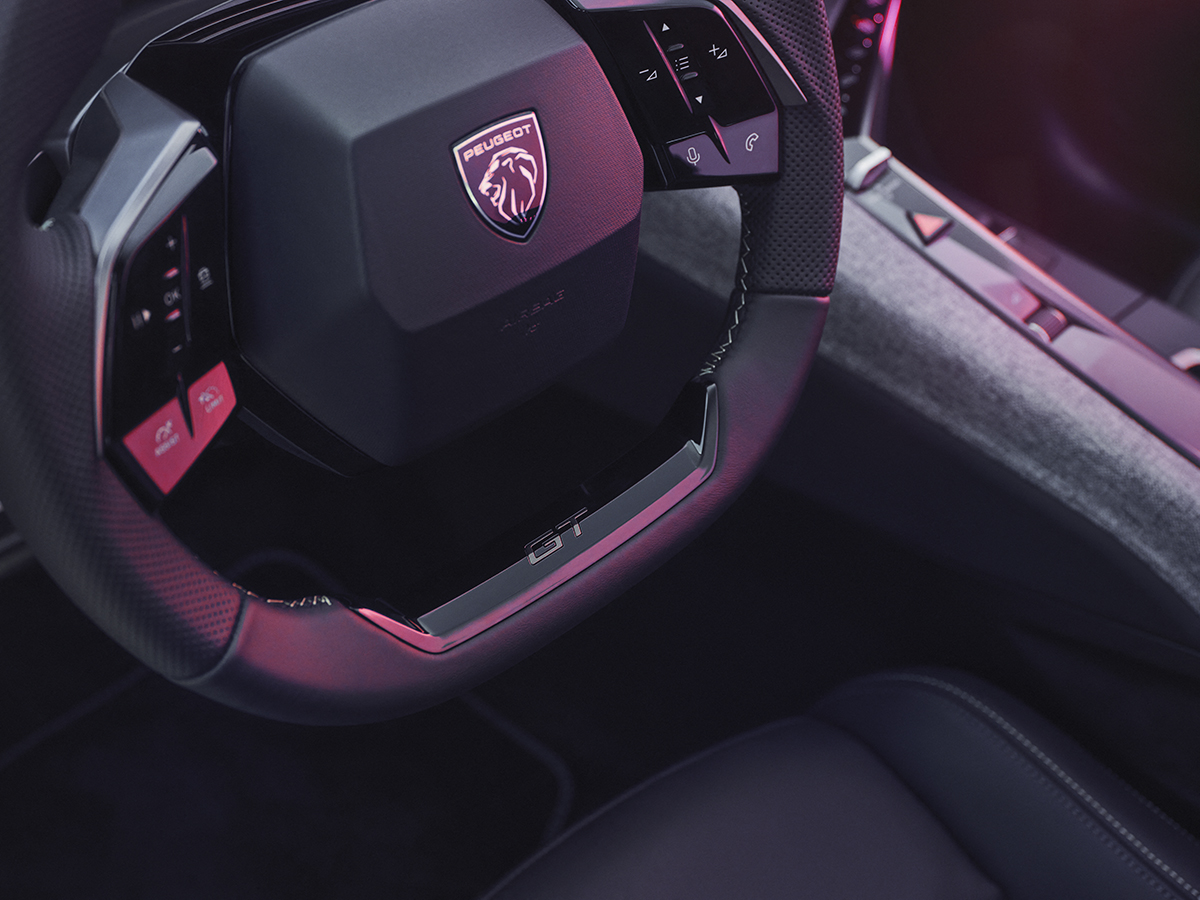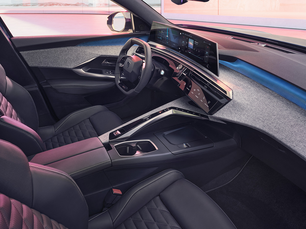 Peugeot表示新Panoramic i-Cockpit®將座艙設計與駕駛樂趣提升新的水準。21吋高清曲面螢幕將數位儀錶與中央觸控螢幕結合為一,而氣氛燈也會從這懸浮式螢幕下方映射出來。延續一貫傳統,中控台主要控制介面與曲面螢幕皆略為偏向駕駛側,也讓功能介面仍維持副駕駛座也可伸手可及之處,另在中央空調出風口下方設有i-Toggles快捷功能觸控面板,車主可依喜好設定10組快捷功能。