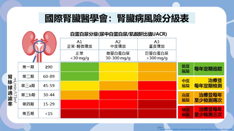 「腎臟病風險分級表」依eGFR、UACR將腎臟病風險分為綠燈(低度風險)、黃燈(中度風險)、橘燈(高度風險)、紅燈(極高風險)。吳麥斯理事長提到,一旦進入紅燈區可能就會面臨住院、透析、死亡風險。