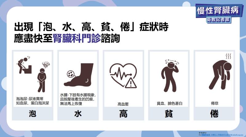 透過定期篩檢、正確的治療,台灣腎臟醫學會相信未來台灣將會擺脫洗腎王國之名。最後,趙家德醫師也提醒,民眾若有「泡、水、高、貧、倦」症狀時,應特別留意可能是慢性腎臟病,應及早至腎臟科門診檢查。