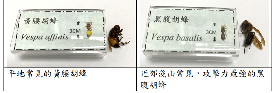 其中最常見的黃腰胡蜂,身體下半處腹部有黃色顯眼的腰帶,屁股後端則是黑色尾部,常見於平地。另外攻擊力最強的黑腹胡蜂,身體瘦長、全身黑色,比較容易出現在近郊淺山,請民眾多加注意。