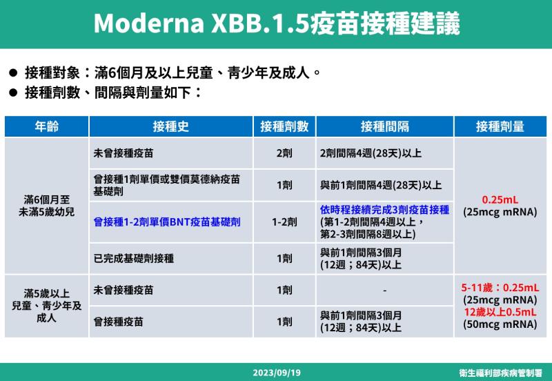- 曾接種過1劑單價或雙價莫德納疫苗:應接種1劑XBB.1.5疫苗,並與前1劑相隔4週以上