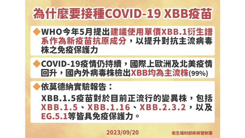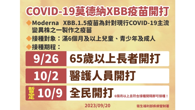 疾管署表示,目前國內外疫情仍持續且以XBB為主流病毒株,經衛生福利部傳染病防治諮詢會預防接種組(ACIP)於今年8月30日參酌WHO及國際各國建議、莫德納 XBB.1.5疫苗臨床試驗報告、用法用量與國內目前COVID-19疫苗儲備及使用情形,建議今年9月至明年9月全民接種1劑(除滿6個月至未滿5歲幼兒未曾接種者接種2劑等)莫德納XBB.1.5疫苗。
