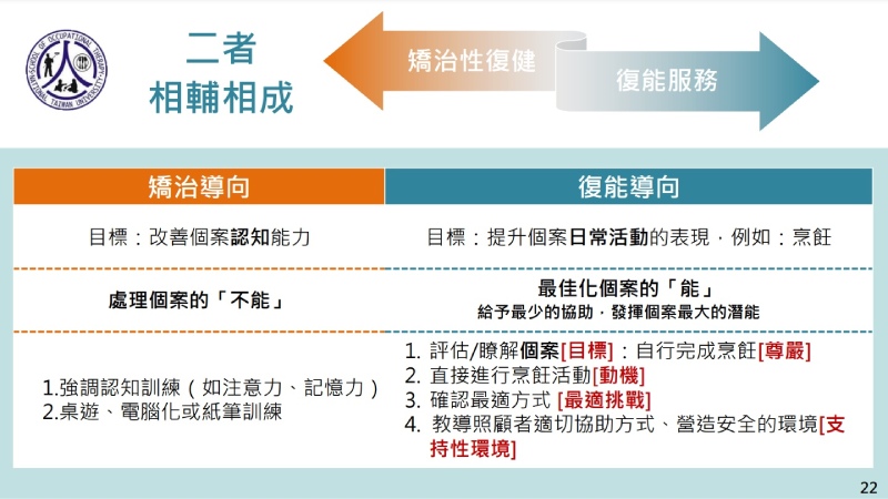 她呼籲確保失智者的醫療復健權利,儘可能延緩認知衰退、延長獨立的時間,支持失智者的生活安排、社區參與。例如開車與駕駛議題,除了不讓失智者上路,能否思考讓失智者「可以訓練,儘可能維持?」尤其政府是領頭羊,有責任推動各項政策與投入資源,加以宣導提供優質、具實證、方便、可近的服務。