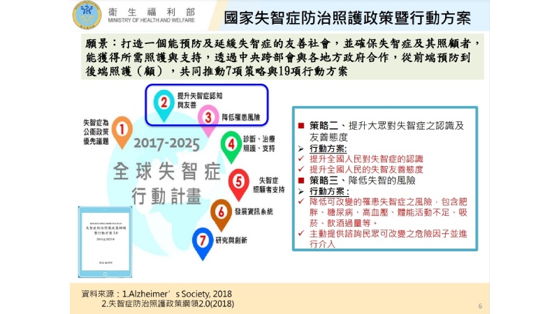 面對「失智」課題,我國超前部署,是全球第13個制定全國性失智症政策的國家,從國家政策、降低罹患風險、醫療診斷、照顧服務與福祉,到技術研發,全方面發展失智照護服務網絡,22個地方政府也都訂有行動計畫。國健署也連結22個地方政府,推動前端預防及營造友善社區,截至112年6月底,全國累計有160個失智友善社區,超過1萬3千家失智友善組織,社區民眾加入失智友善人員數超過48.9萬人。吳昭軍呼籲國人除了認識失智症,及時採取因應及預防行動,掌握及時就醫診斷的時機外,也提醒高齡長者,參與社交生活不僅是身心健康與快樂的泉源之一,亦有助於預防及延緩失智。今年國健署串聯22縣市以支持「同在行動+1」精神,號召民眾一起鼓勵失智者發揮自我能力,走出封閉,融入社會,讓台灣成為一個失智友善的互助社會。
