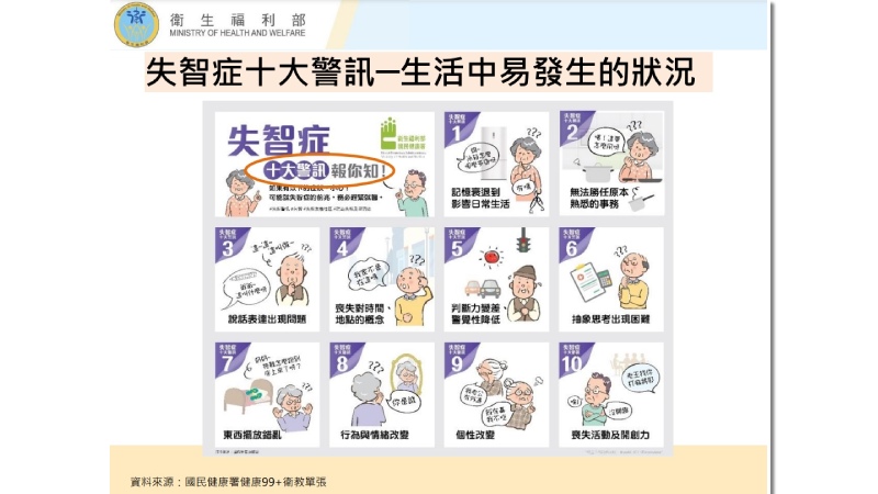 失智症被視為本世紀全球公共衛生面臨的最大挑戰之一,為響應2023年國際失智症月活動主題「Never too early, never too late」(現在就是最佳時刻),國民健康署署長吳昭軍提醒,國人應及早認識失智症十大警訊徵兆,當發現身邊家人、親友有下列徵兆,應及早協助就醫診斷,以達到預防及延緩失智。