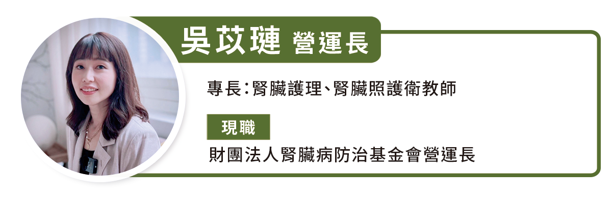 腎臟病防治基金會營運長吳苡璉指出,不少人認為「腎臟病是老年人的病」,其實不然。臨床上雖然年輕族群得到腎臟病的比例較低,但過往也會發現年輕的腎友,在健康檢查中發現腎功能異常,然而病人自覺年輕,加上慢性腎臟病前期幾乎沒有症狀,因此忽略追蹤,但繁忙的工作及不正常的飲食習慣,讓腎功能快速惡化,她提醒年輕族群要正視每次有健康檢查的機會,最重要的是檢查後的報告要認真閱讀並詢問專業意見,有異常就要積極追蹤,才能避免疾病的發生。