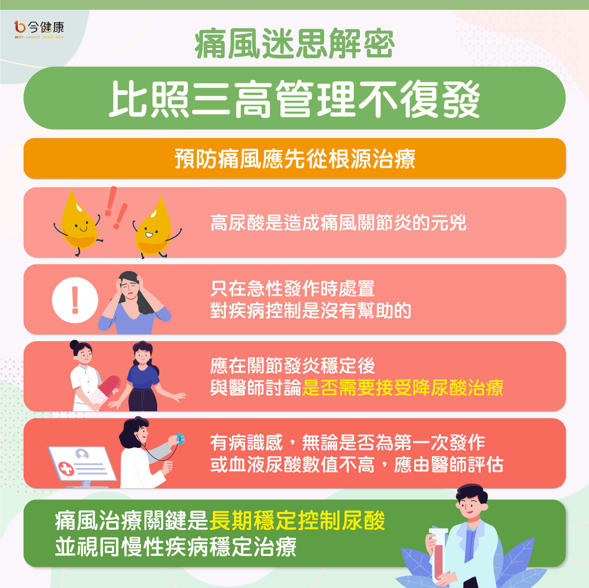 別等到痛風發作才就醫!醫師舉出痛風病友常見的錯誤觀念,像是痛風急性發作時,自行使用降尿酸藥物應對,不僅無法消炎,還會加劇關節炎(已服用者不要擅自停藥);而秋水仙素是用於預防痛風再復發,如果依靠秋水仙素治療急性痛風發作,往往需要相當高的劑量,大部分患者無法承受其副作用。如有需要使用,建議仍需至門診由醫師評估,根據不同情形(例如腎功能等)給予合適的消炎止痛藥物。