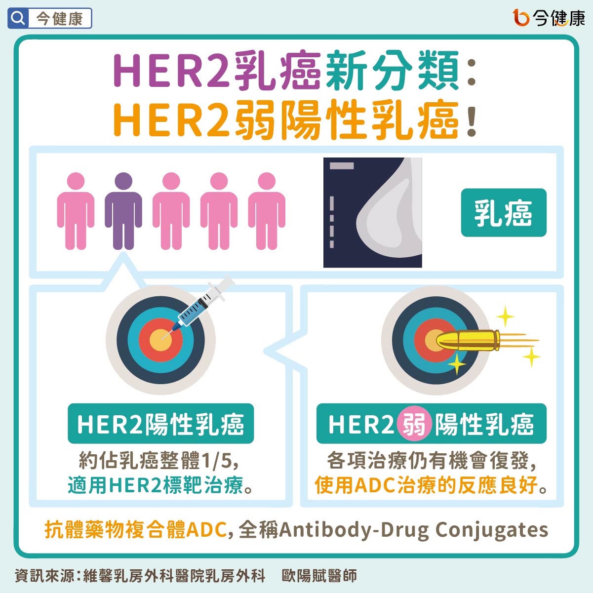 歐陽賦醫師表示,這群病友即為「HER2弱陽性乳癌」,是乳癌的一種新分類,占轉移性乳癌病友的一半左右,對抗體藥物複合體(ADC,全稱Antibody-Drug Conjugates)治療的反應良好。研究顯示,轉移性HER弱陽性乳癌在醫師評估下接受抗體藥物複合體ADC治療,無疾病惡化存活期與整體存活期皆獲得有意義的改善。