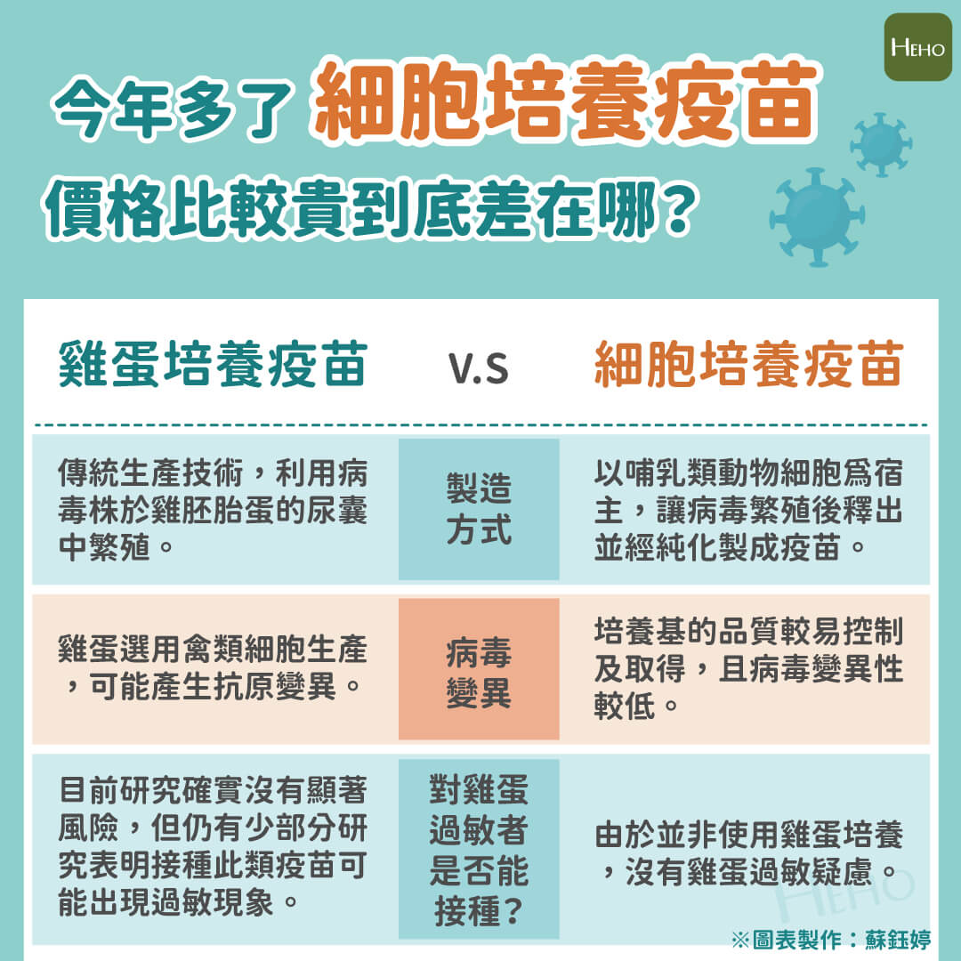 而雞蛋培養、細胞培養最主要的差異在於來源,前者為雞胚胎培養生產、後者是利用哺乳動物細胞生成,若本身對雞蛋過敏者則可以選擇細胞培養,否則兩者效力差異不顯著、副作用類似。