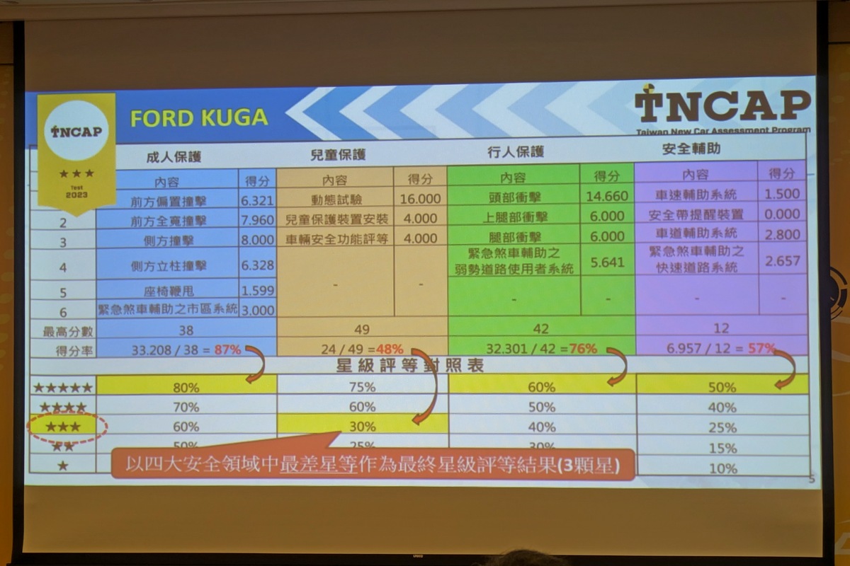 今日交通部公布TNCAP第三批評等結果,此次受測車輛為Ford Focus與Kuga,其中Focus獲得五顆星,但Kuga卻跌破眼鏡僅得三顆星,之所以只有三顆星是因這項目被扣分。
