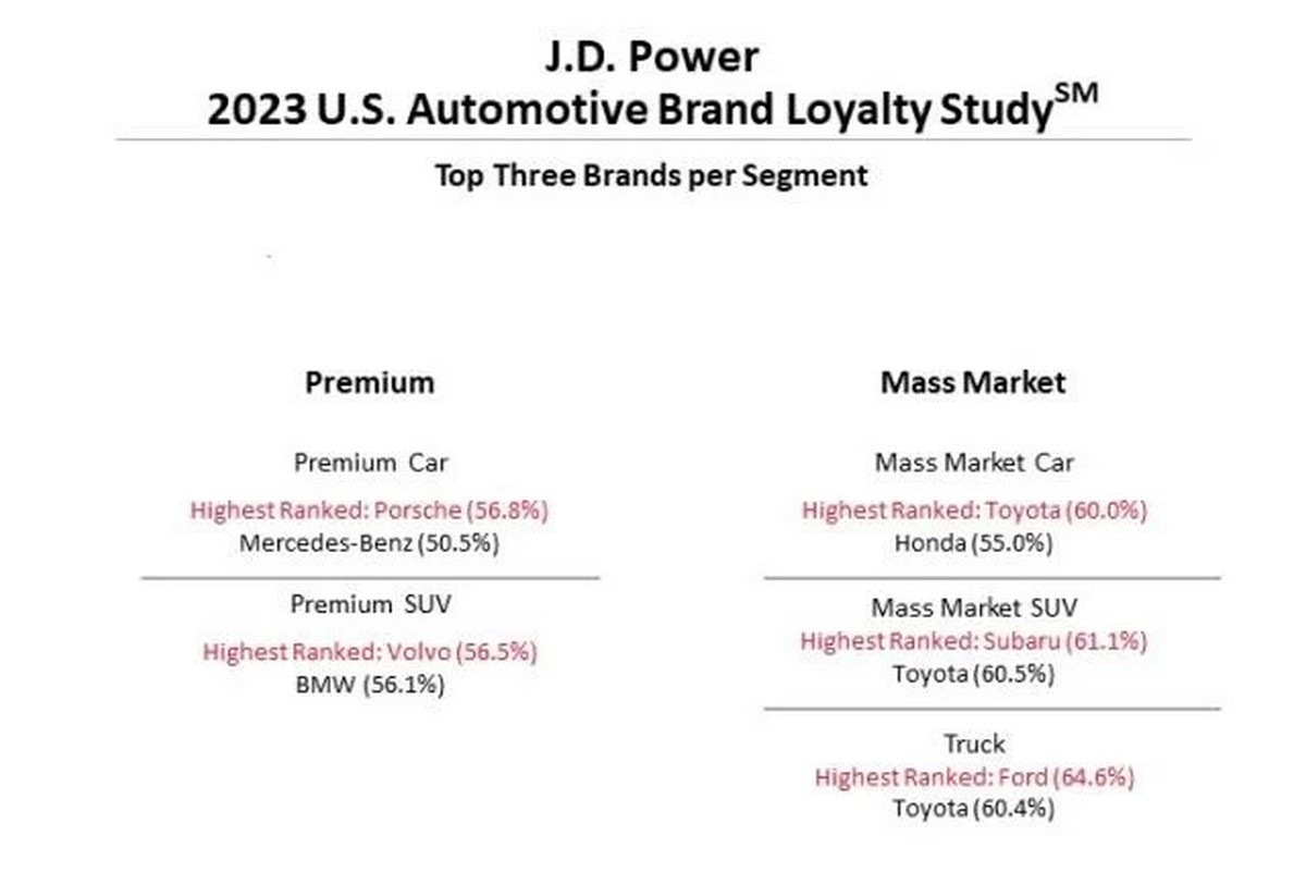 在豪華品牌中Porsche較去年略微下滑但仍以56.8%支持度再次奪冠,Mercedes-Benz則以50.5%得到第二。而在豪華休旅市場中Volvo以56.5%和BMW 56.1%取得第一與第二成績。至於一般品牌Toyota以60%獲得最多消費者支持,但與過往63.6%相比也是呈現衰退,第二名則是由55%的Honda獲得。一般休旅市場則由Subaru的61.1%支持度奪下冠軍,Toyota以60.5%緊跟在後,再來皮卡市場Ford以64.6%忠誠度擊敗Toyota的 60.4%。