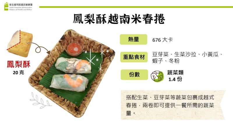 另外,主廚陳之穎發現搭配芽菜、瓜類等在地食材,更能突顯月餅的風味,適合設計成具南洋風情的料理,而且添加蔬果、乳品等,不但營養均衡還富含膳食纖維、植化素、鈣質等營養素。因此,國健署、主廚陳之穎分享打破傳統單獨食用月餅的2吃法:- 鳳梨酥越南米春卷: