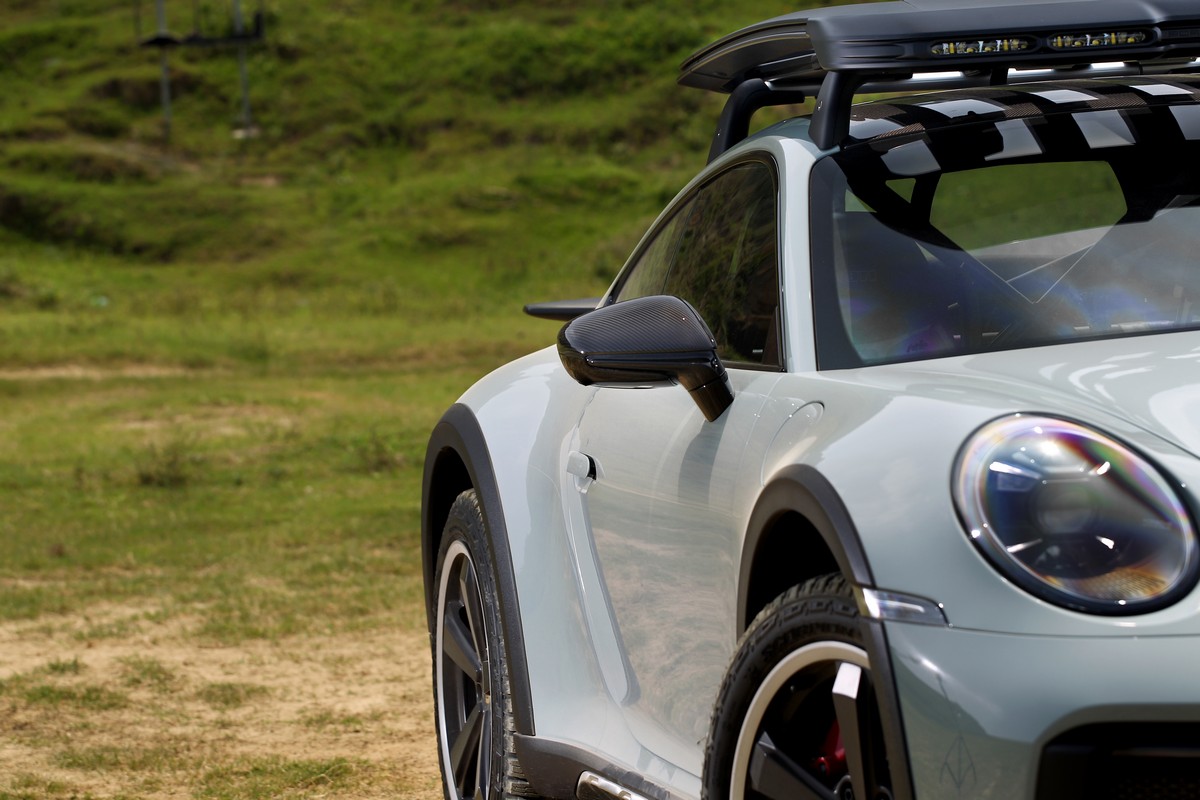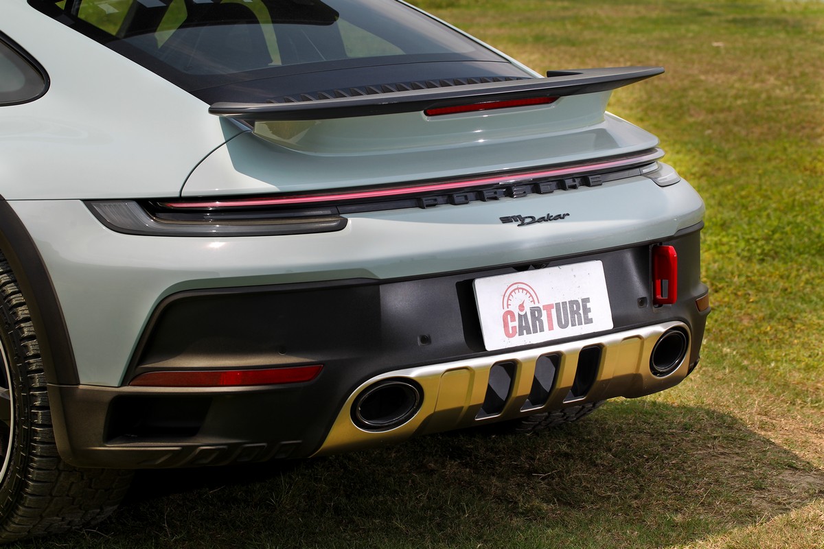 一般對於911的印象就是圓潤大眼和迷人的豐臀還有低扁的跑車身形,從沒想過有一天911竟然會長高,但911 Dakar就在保有這些條件設定下較911增高了50mm。增高後的911 Dakar很容易就讓人看出不同,雖然配置具有擾流設計的碳纖維引擎蓋和尾翼散發強烈的性跑車氣勢,但車身與輪拱的防護飾板及選配的車頂行李架,展現更多的是高人一等的越野氣息。