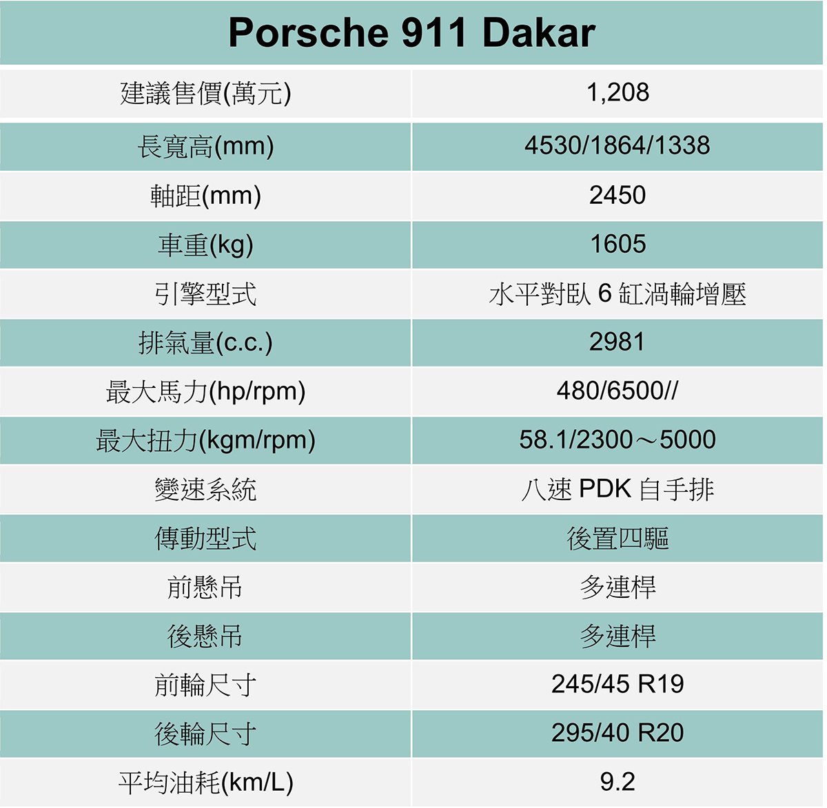搭載3.0升六缸渦輪引擎,具有480hp/58.1kgm最大輸出。 如果你覺得車高較高的911 Dakar就不是911了,那你就是低估了Porsche調校的功力,高如Cayenne的休旅車都能有著充滿樂趣的動態表現,何況只是加高50mm的911 Dakar,而且別忘了這車是隸屬於911車系。為了符合911銘牌身分,911 Dakar配置PDCC動態底盤控制及防傾穩定系統,在兩大利器助益下911 Dakar除能在越野地玩耍外,於山路亦有著和911幾乎無異的動態身手,無論急彎或是高速彎角都能輕易通過,而鮮少的側傾與沉穩的底盤,加上在後方不斷股催的聲浪,在在都在告訴駕駛我可以的,你可以在開快點。