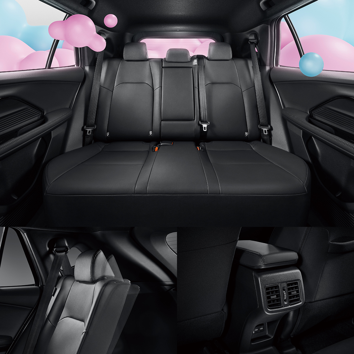 在乘坐空間上,Yaris Cross透過最大化軸距設計,在4.3公尺的車身尺寸下創造出2,620mm的優異軸距表現,搭配上出色的頭部與膝部空間,提供乘客寬闊的乘坐體驗!此外,Yaris Cross更配備兩段椅背傾角可調後座椅、後座出風口(酷動版、潮玩版)及雙Type-C充電孔,舒適與便利滿分。