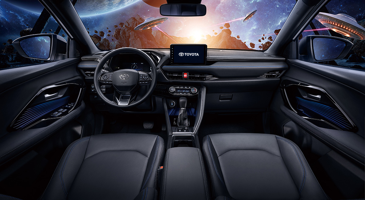 Yaris Cross以駕駛者為導向,座艙採雙層式環艙設計,創造出讓駕駛者能夠專注駕駛的空間,同時亦保有副駕乘客寬闊的空間感受。內裝以大量鋼琴烤漆搭配浮雕設計門飾板,增添車室質感,座椅則以藍色縫線點綴(潮玩版),創造年輕動感的風格。