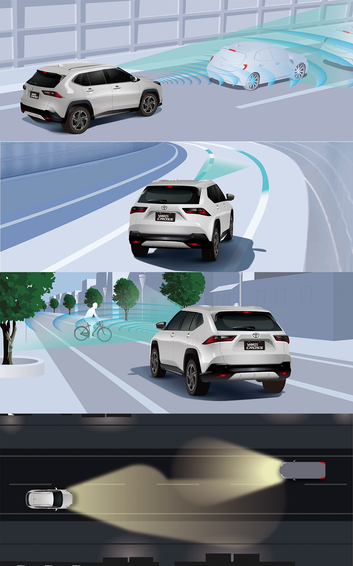 為全面守護消費者安全,Yaris Cross標配EPB電子駐車煞車系統與Auto Hold電子定車煞車系統、6SRS氣囊及Toyota Safety Sense安全系統。TSS包含消費者重視的ACC全速域主動式車距維持定速系統(含Stop & Go)、PCS預警式防護系統、與車道行駛輔助系統等主動安全配備。另外,還搭載BSM盲點偵測警示系統(潮玩版)、RCTA後方車側警示系統(潮玩版)等,最高搭載29項主、被動安全配備註4,兼顧駕駛者與乘客的乘坐安全。