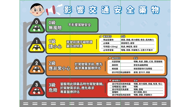 有鑑於此,台北市立聯合醫院針對交通安全藥物分級制訂宣導,將藥品分成四級,從最危險的安眠藥、抗精神病藥、散瞳劑、肌肉鬆弛劑等處方藥,到民眾最常接觸的止咳藥、抗組織胺以及含有可待因的藥水等分門別類製作教材,開始訓練種子藥師,並於台北市交通運輸部門、計程車服務站等進行宣講,希望能提升全民用藥識能。
