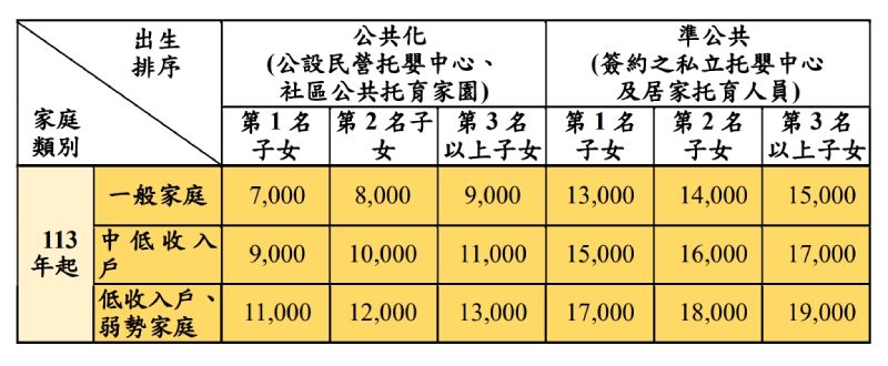 社會及家庭署於9月26日在新聞稿中提到,明年1月起將每名幼兒托育費用由原先控制在家庭可支配所得10%-15%降低為5%-10%,送托公共托育機構者每月補助7,000元、送托準公共托育服務者每月補助1萬3,000元。因應托育補助再調高,社會及家庭署表示,明年預算預計將增加39.9億元,共計112.7億元,預估1年會有9.5萬名兒童受益。