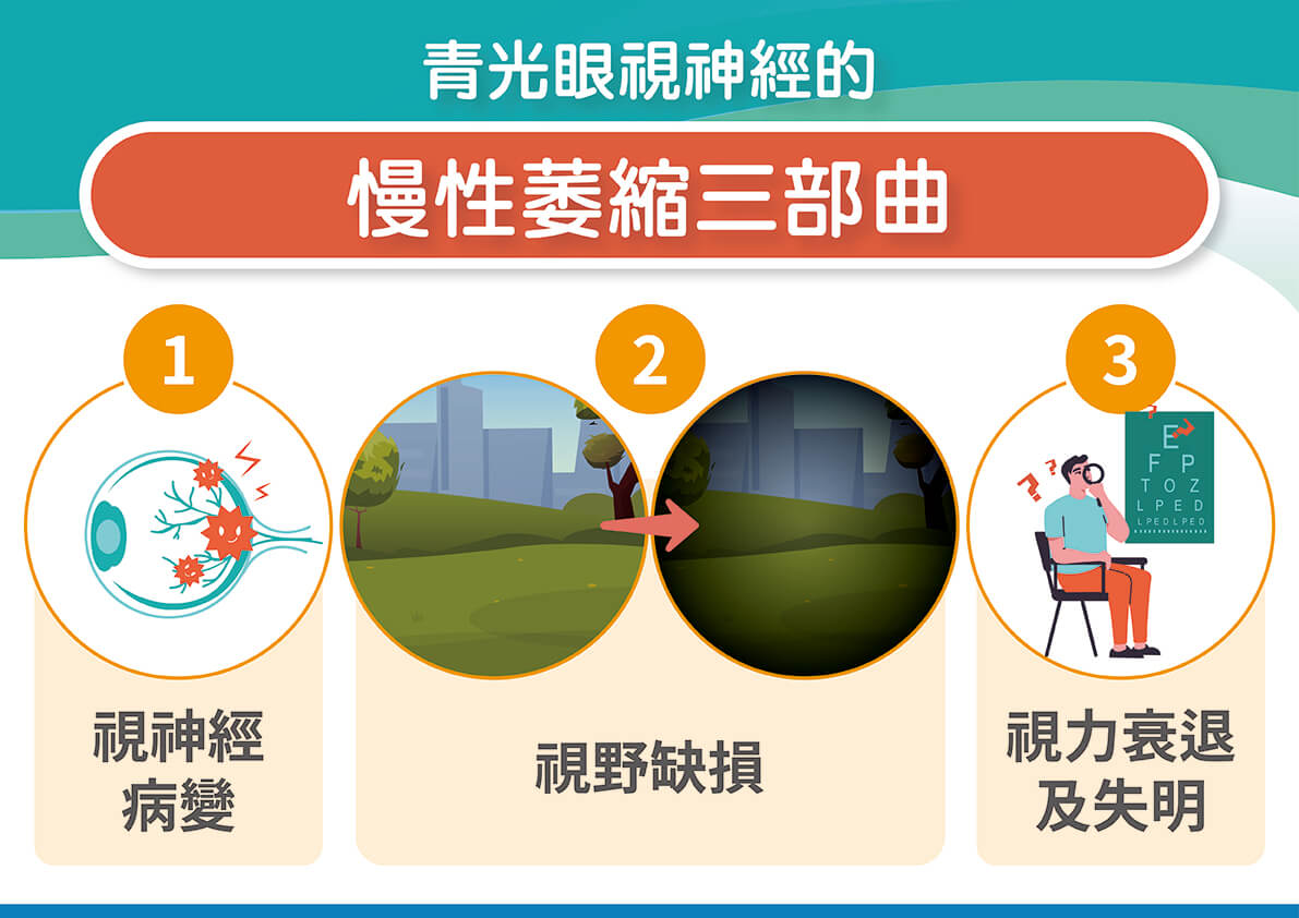 很多人固定檢查「視力」沒問題,為什麼被診斷有青光眼?陳賢立醫師表示,青光眼是視神經的慢性萎縮三部曲,先有視神經病變,再導致視野變化,最後造成視力衰退及失明。觀察眼底神經纖維缺損與視神經的變化是診斷青光眼最重要的步驟,只做視力檢查不足以發現青光眼。建議35歲開始可每年一次完整的眼科篩檢,尤其是高危險群如青光眼家族史、高度近視,高血壓和糖尿病,長期以類固醇治療等慢性病患者,需特別留意!
