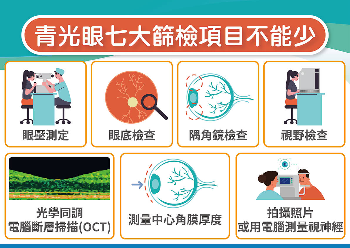 完整的青光眼篩檢應包括:眼壓測定、測量中心角膜厚度、隅角鏡檢查、視野檢查、眼底檢查、拍攝眼底照片、光學同調電腦斷層掃描(OCT)。